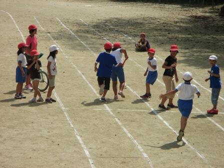 ・ 28日に開催する運動会では、向山児童館の園児も競技・演技をします。そのため、運動会前に何回か本校の運動場で練習をします。今日はその一回目でした。先生に公用車で連れてきてもらって、1時間半ほど練習をして帰りました。写真の4名は園児の一部で、年長児が3名、年中児が1名です。