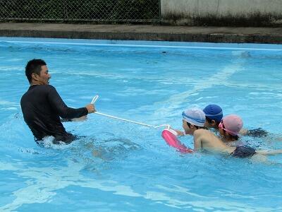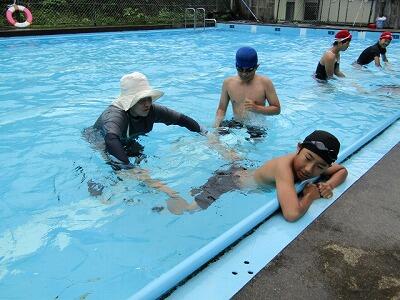 梅雨まっただ中、雨模様の毎日ですが、気温が少しずつ上がってきて、水泳指導がやっと本格化してきました。今日は、3・4年、5・6年がプールに入りました。3・4年は、水中宝探し・だるま浮き・クラゲ浮き・大の字浮き等水に慣れる運動を楽しそうにやっていました。5・6年はさすがに泳ぎが上手く、ふし浮き・けのび・クロール・平泳ぎと本格的な泳ぎの練習をしていました。7月には村の水泳大会もあることから、これから益々練習に熱が入ることでしょう。