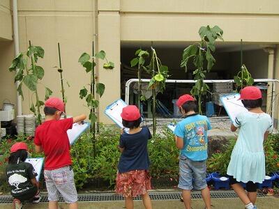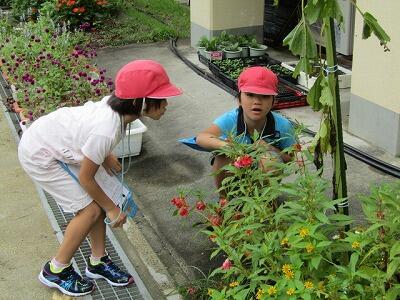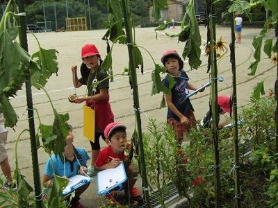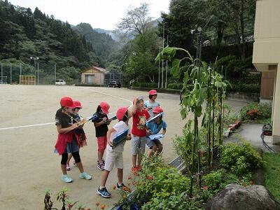 9月2日(水)理科の時間に、3年生が育てているひまわりとホウセンカの観察をしました。