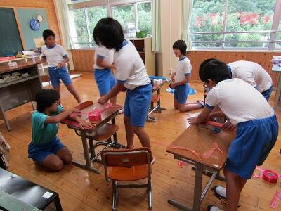 9月2日(火)今日も外はくもり。しかし、6年生は運動会の練習に備え、運動場のライン引きや応援に使う道具づくりに一生懸命に取り組んでいました。