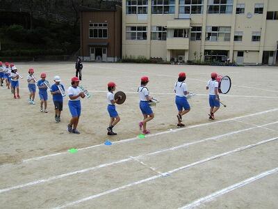 これまで、各学年で室内において行っていた鼓笛の練習でしたが、運動会まであと2週間あまりとなり、いよいよ運動場での歩きながら隊形変化を加えての練習が始まりました。