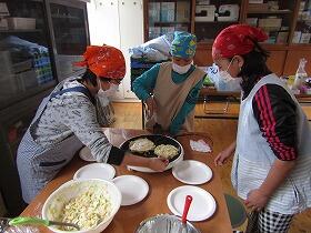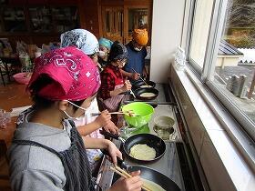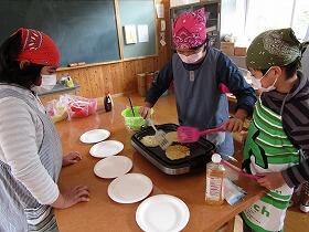 12月21日(月)2学期も残すところあとわずかとなり、尾向小学校の各学級では、子ども達が計画を立て、学級活動として「お楽しみ会」が始まりました。今日は先頭を切ってまず5・6年生が家庭科の調理実習で磨いた腕を生かして、お好み焼きとクレープを作って楽しんでいました。
