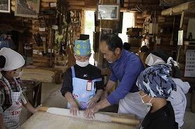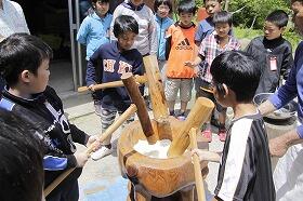 交流椎葉2日目は、朝から向山日添地区の「つぶつぶまんま」という施設に集合し、地域の方々の指導の下、そば打ち、餅つき、竹細工作り等を体験した後、白鳥神社の境内で自然体験ゲームを行いましした。大自然のまっただ中での体験活動を一日中満喫した子ども達はとても満足げでした。ご協力いただいた地域の皆様本当にありがとうございました。