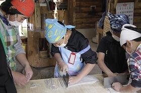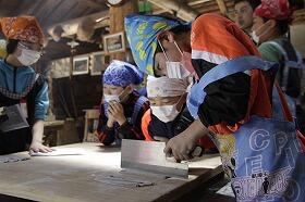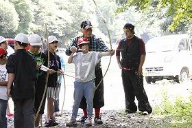 その後、尾向地区の春祭りの時に各集落で行われる「的射」を体験しました。見事に当てた子どももいて歓声が上がっていました。