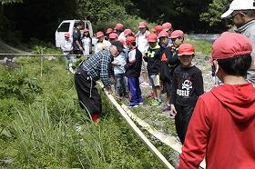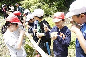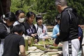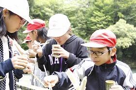 そこでは、地域の方々の指導の下、自分たちで竹を割り、釜で火をたいて麺をゆで、水路を組み立て、自然のわき水を引いてそうめん流しをしました。大自然の中で食べるそうめんの味は格別だったようで、みんなお腹いっぱい食べていました。