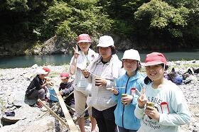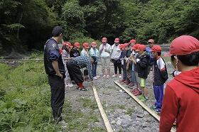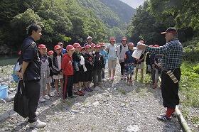 3日目も好天に恵まれ、尾向小5・6年生9名と草川小5年生13名の子ども達は、学校から2kmの道のりを歩いて、尾前川のほとりの川原に向かって出かけていきました。