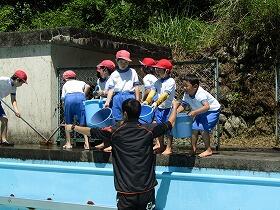教頭先生が消防団のポンプを使い、川の水をくみ上げて、勢いよく汚れを流すのを合図に、各学年で仕事を分担し、児童31名、職員7名力を合わせて掃除をしました。約2時間で見違えるようにきれいなプールになりました。