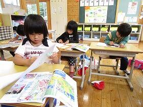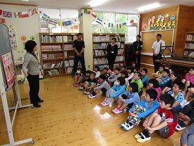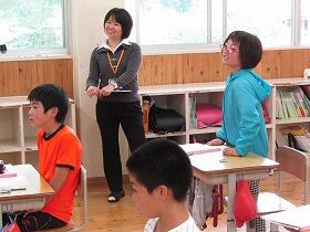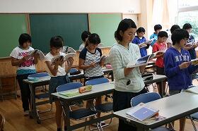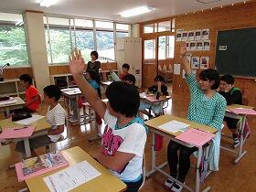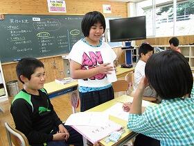 今日から5・6年生の集合学習が始まりました。覗いてい見ると、5年生はALTの先生と外国語活動の学習で、二人組を作りながら「ハロー、マイネームイズ・・・」と、楽しいそうに自己紹介をしていました。6年生は国語の学習で、詩を読み深めて日本語のひびきを楽しんでいました。
