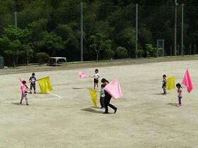 灰色に曇っていた空から夏の日差しが差し始めた午後、ふと運動場を見ると黄色やピンクの鮮やかな旗が動いていました。今年も1年生が鼓笛の練習を始めたようです。先生の声に合わせて懸命に旗を振っていました。