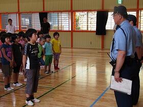 7月4日(月)不審者対応避難訓練を行いました。椎葉駐在所の所員の方が不審者に扮して「子どもに会わせろ」と教室に無理矢理上がろうとしてきたという設定で行いました。