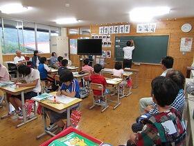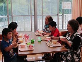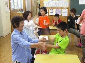 今日は年に一度の「世代間交流学習」でした。あいにくの雨模様でしたが今年もたくさんの地区の高齢者の方々に来ていただき、授業参観の後、昔の遊びや昔の暮らしの話・絵描き等で交流を深めることができました。その後、子ども達と一緒に給食も食べていただき、和やかなひとときとなりました。