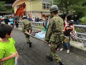今日は椎葉村全体での防災訓練でした。尾向地区は今年の重点地区ということで、自衛隊、村消防本部、10部・11部消防団の方々が来られて大々的に訓練が行われました。防災無線で避難勧告が流されると、地区の方々も続々と尾向小体育館に集合され、みなさん真剣な表情で、炊き出し訓練や自衛隊による救助訓練の様子をご覧になられていました。