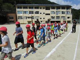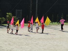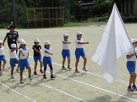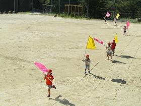 いつもなら先頭に立つ上級生についていけばよい部分もあるのですが、今回は3・4年生が先頭でリードし、しっかりと代役を務めていました。旗を振る役目の1年生も自分たちの立ち位置や動きを覚え必死に走っていました。