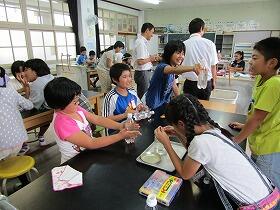 乙島での自然体験ツアー、門川湾クルーズ、庵川漁港競り市見学、音楽・体育・理科等の授業と3日間とても充実した交流学習でした。多人数での授業、ホームステイ等椎葉の子ども達にとっては自信につながるもとなりました。