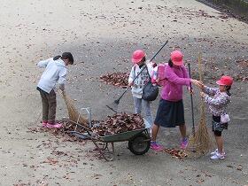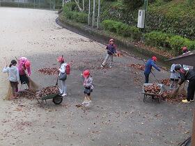 秋深し、子ども達は朝登校すると、カバンを下ろすこともせず、運動場の落ち葉を掃いています。掃いても掃いても、次の日にはまたたくさんの落ち葉が落ちている・・・、しかし子ども達は負けていません。