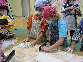 そば打ち体験では、講師や保護者の方々に手順を教えていただきながら活動をし、そばを打った後、全員で試食を行いました。自分たちで栽培したそばの味は格別のようでした。子どもたちは、これまでの活動を思い出しながら、おいしくそばをいただいていました。