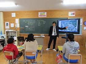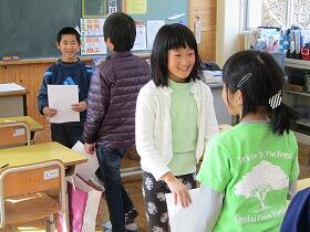 今日は2学期最後のALT訪問日でした。5・6年生の教室では2学期に学習したことの振り返りが行われていました。地図が映された画面を見ながら、「書店に行く道を教えてください」という英語の質問に対して、子ども達は「ゴーストレイト、ターンライト・・・」と巧みに道案内をしていました。たいしたものです。給食の時間は2年生がALTの先生と一緒に楽しいひとときを過ごしました。