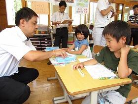 終業の日の5時間目、1年生の教室をのぞいてみると、担任の先生から夏休みの学習や生活についての細かいお話が行われていました。そしてその最後に、1年生にとって初めての「あゆみ」が一人一人に手渡されました。ドキドキしながらも、うれしそうな1年生でした。