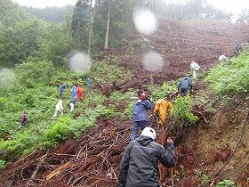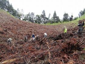 7月8日(土)朝から雨が降る中、焼畑体験学習の始まりを告げる「やぼきり」を行いました。当日は、公民館役員、保護者、青年団、教職員総勢30名の皆さんに集まっていただきました。水無地区の伐採跡地の急斜面を、焼畑が安全に効率よく燃えるように整えていきました。雨の中カッパを着ての作業となり大変だったと思います。本当にご苦労様でした。