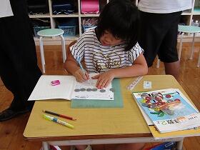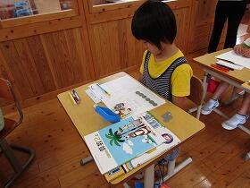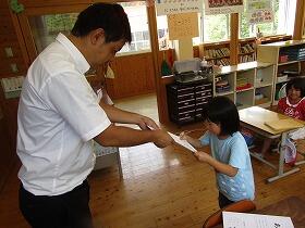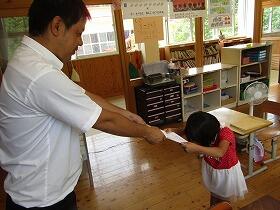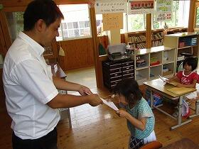 終業の日の5時間目、1年生の教室をのぞいてみると、担任の先生から夏休みの学習や生活についての細かいお話が行われていました。そしてその最後に、1年生にとって初めての「あゆみ」が一人一人に手渡されました。ドキドキしながらも、うれしそうな1年生でした。