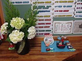 7月になり、学校の玄関には、紫陽花の花と涼しげな折り紙の飾りが、子ども達を迎えてくれいます。