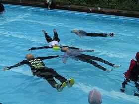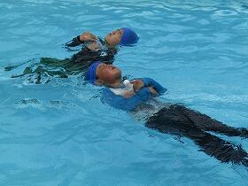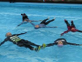 これはもし万が一服や靴を身に付けたまま水に落ちてしまった時、どうやって命を守るかを体験するものです。いつもと違う服の重みがあり思うように動けない中、仰向けで浮く方法や、ペットボトルを使って浮く方法を学びました。