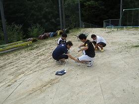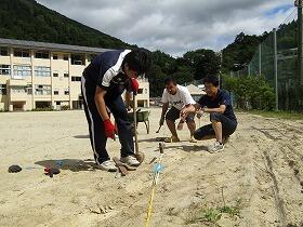 夏休み最後の週末を迎えました。いよいよ週明けから2学期が始まります。今日はすぐに始まる運動会練習に向けて、運動場のポイント打ちやテント設営、除草作業を行いました。