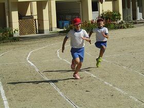 全校体育2回目の今日は、朝の涼しいうちに「徒走」の練習をしました。子ども達はトレーニングの後、ゴール目指して一生懸命走りました。