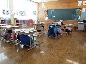 11月の津波・防災の日に合わせて、今週はシェイクアウト(地震に備える防災訓練)を行っています。毎日時間帯を変えて、「緊急地震速報」の放送を流して、どこにいても安全な避難姿勢がとれるようにしています。子ども達は全員、素早く、真剣に取り組んでいます。