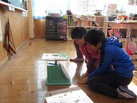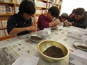 先日収穫したそば実の「石取り」を行いました。少しずつ手分けして、根気よく混じっている小石や茎等のゴミを取り除き、来る24日(金)収穫祭でのそば作りの準備をしました。特に高学年の子ども達は手慣れたもので、きれいにゴミを取り除いていました。