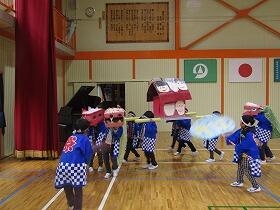 今日は朝から雨模様。冷たい空気に包まれながらも、体育館からは子ども達の元気なかけ声が聞こえてきます。のぞいてみると、24日(金)に迫った「焼畑収穫際」に向けて、1・2年生が練習をしていました。来てくださる皆様に喜んでもらおうと、寒い体育館で一生懸命に声を出していました。