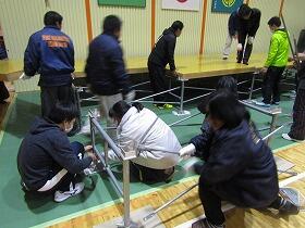 1月15日(月)夕方、たくさんの保護者の方々の手により、今年もステージ設営が行われました。このステージは、2月の学習発表会、3月の卒業式、4月の入学式と大切な行事のために、毎年この時期設営していただきます。
