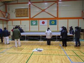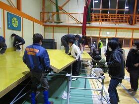 1月15日(月)夕方、たくさんの保護者の方々の手により、今年もステージ設営が行われました。このステージは、2月の学習発表会、3月の卒業式、4月の入学式と大切な行事のために、毎年この時期設営していただきます。
