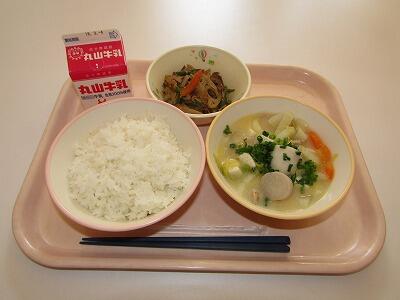 今日の献立は、麦ご飯・肉団子のスープ・五目豆・牛乳でした。2校間集合学習だったので賑やかな給食時間となりました。