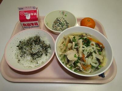 今日の献立は、減量麦ご飯、山菜うどん、白和え、ふりかけ、みかん、牛乳でした。山菜うどんの麺がコシがあって美味しかったです。