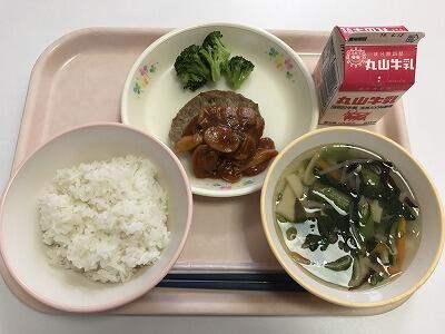 ※昨日の、新年度最初の給食は、麦ご飯、五目スープ、煮込みハンバーグ、添えブロッコリー、牛乳でした。