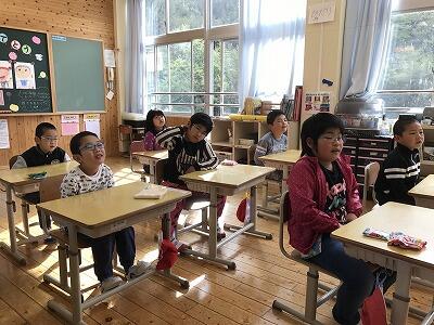 【お勉強では、2年生のお兄さん、お姉さんと同じ教室で、初めての複式学級でのお勉強でした】↓