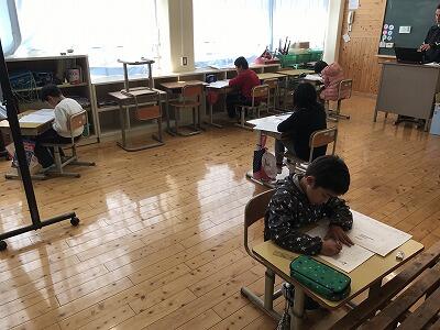 【お勉強では、2年生のお兄さん、お姉さんと同じ教室で、初めての複式学級でのお勉強でした】↓
