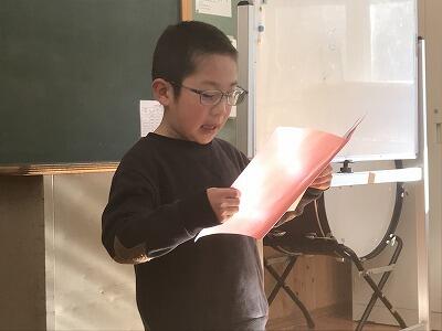 【終業式では、1年生の代表児童が2学期の反省を、しっかり発表することができました】↓