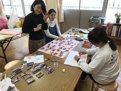 【教職員で、壁面に張る6年生の写真を切り取って模造紙に貼り付けています】↓