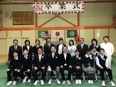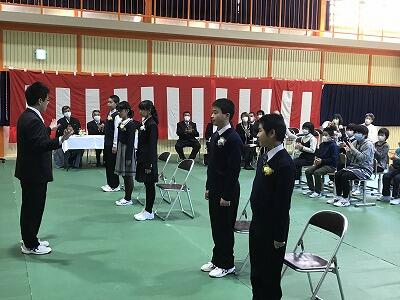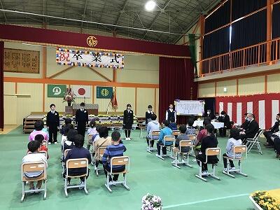 今年度の卒業式は、コロナウイルス感染症対策のため、当初案内していましたご来賓を椎葉村教育委員会 教育長職務代理者の尾前賢了様、公民館長 蔵座二九生様、PTA会長 椎葉友和様の3名に減らし、内容も縮小して1時間以内で終わるようにしました。