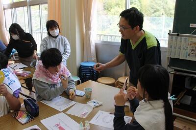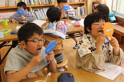 午後に歯科検診と歯磨き指導がありました。保健室で子どもたち一人一人の歯の検査をした後、マルチパーパスにて、椎葉おおもり歯科クリニックの大森先生と歯科衛生士の方々に歯磨き指導をしていただきました。染め出しで磨き残しを自分で見付け、磨き残しの無い歯磨きの仕方を丁寧に教えていただきました。早速、今晩の歯磨きから取り組めるといいですね。