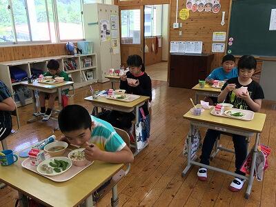 今日は日曜日ですが椎葉村合同検診で登校日でした。午前中、椎葉小学校に行って検診を受けた後、学校に戻ってきて給食でした。今日のメニューは、「竹の子ご飯」「わかめスープ」「ポークシューマイ」でした。季節を感じさせるメニューでみんな美味しそうに食べていました。さて、国の「緊急事態宣言」解除を受け、19日(火)から通常通りの学校が始まります。これからの子どもたちの活躍が楽しみです。