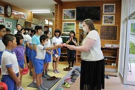 椎葉村のALT(外国語指導助手)のカイリー先生が米国に帰国することになり、今日は最後の訪問日でした。はじめに子どもたちからのメッセージを伝え、その後カイリー先生から今までの思い出や感謝の言葉をいただきました。最後に鼓笛で「パプリカ」の演奏をプレゼントしました。カイリー先生、今までありがとうございました。お元気で。