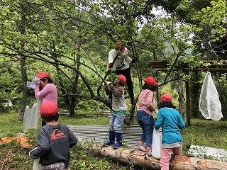 9日(火)に旧校舎跡地に梅ちぎりに行きました。昨年に比べるとあまり実がなっていませんでしたが、それでも20kgほどの収穫ができました。梅ちぎりの後は、ツリーハウスやジップラインで遊びました。雨の天気予報にも関わらず、子どもたちの願いが通じたのか、時には太陽も顔をのぞかせるほどの天気となりました。尾前一日出さんには、梅ちぎりやその後の遊びで大変お世話になりました。ありがとうございました。