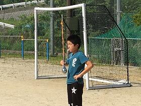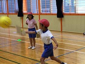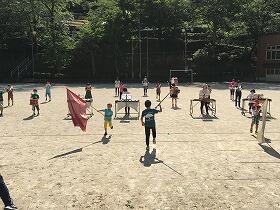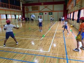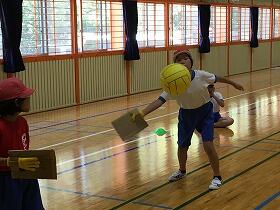 3~6年生は体育科で「ネット型ゲーム」の学習をしています。段ボールで作ったラケットのようなものを手にはめ、ワンバウンドでパスをしたり相手と対戦したりする内容です。ラケットの面を上手に操作し、ラリーが続くようになっていました。本年度から始まった新しい内容の授業です。