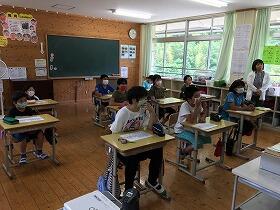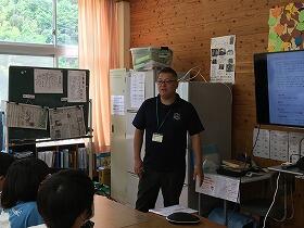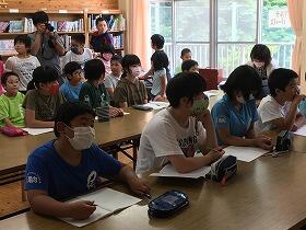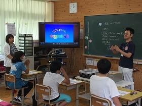 税金の学習をした後、「地方自治」の学習をしました。講師は椎葉村役場地域振興課の尾前義文さんです。地方自治の仕組みを学習した後、7月18日(土)にオープンする「椎葉村交流拠点施設カテリエ」とリモートで結び、テレビ画面を通してオープン前の施設の様子を見学しました。子どもたちは早く行って様々な施設を体験したいという思いを強くしたようです。その後、尾前義文さんが取り組んでいる仕事の紹介もあり、子どもたちは椎葉村の将来について興味・関心を高めました。
