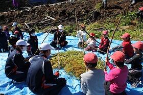 子ども焼畑体験学習「収穫」を実施しました。秋晴れのもと、中学生、保護者、地域の方々のご協力のもと、刈り取り、あやし、唐箕を使っての殻と実の選別を行いました。今年は天候も良く台風の影響も受けなかったため豊作のようです。来月は「収穫祭」を実施します。どんな蕎麦ができ上がるか楽しみです。ご協力してくださった保護者と地域の皆様、ありがとうございました。
