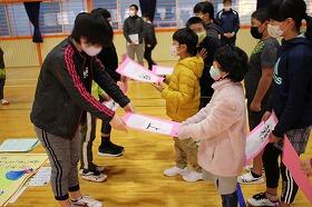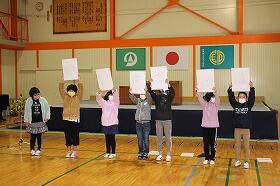 3月5日(金)にお別れ集会とお別れ集会を実施しました。当日朝までの雨の影響で目的地はぬかるんでいて、校内遠足になりました。お別れ集会では1・2年生は「パプリカ」のダンスとメダルのプレゼント、3・4年生は3人の卒業生の名前を使った「あいうえお作文」の発表と色紙のプレゼント、5年生は「炎」の卒業生バージョンの替え歌の発表と卒業生のイメージ漢字のプレゼントでした。下級生の中には涙を流す子どもたちもいて、感動の中に会が進みました。その後、全校レクレーションや宝探し、お弁当やお菓子タイム、映画鑑賞など、校内遠足でも充実した時間が過ごせました。