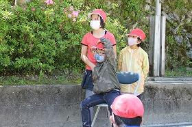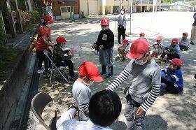椎葉駐在所の2人の警察官をお招きし、交通安全教室を実施しました。主な内容は横断歩道の渡り方と自転車の点検についてです。横断歩道を渡る前と渡る途中で左右の確認をすることを実際にやりながら学びました。自転車の点検は「ブレーキ」「タイヤ」「反射板」「車体」「ベル」の頭文字をとって「ぶたはしやべる」と覚えるのだそうです。命を守るための学習ができました。